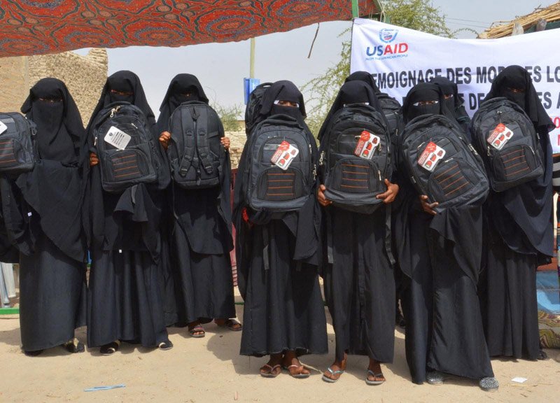 The U.S. State Department–funded Trans-Saharan Counter-Terrorism CVE funding: 1) organized community engagement with local leaders and the government to support girls’ education in rural areas that are threatened by insurgent conflict; and 2) provided supplies and supported engagement with government leaders and local leaders after Boko Haram kidnappings. (Source: Rodney Stubina, photo archive)